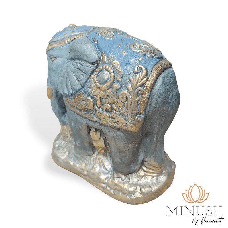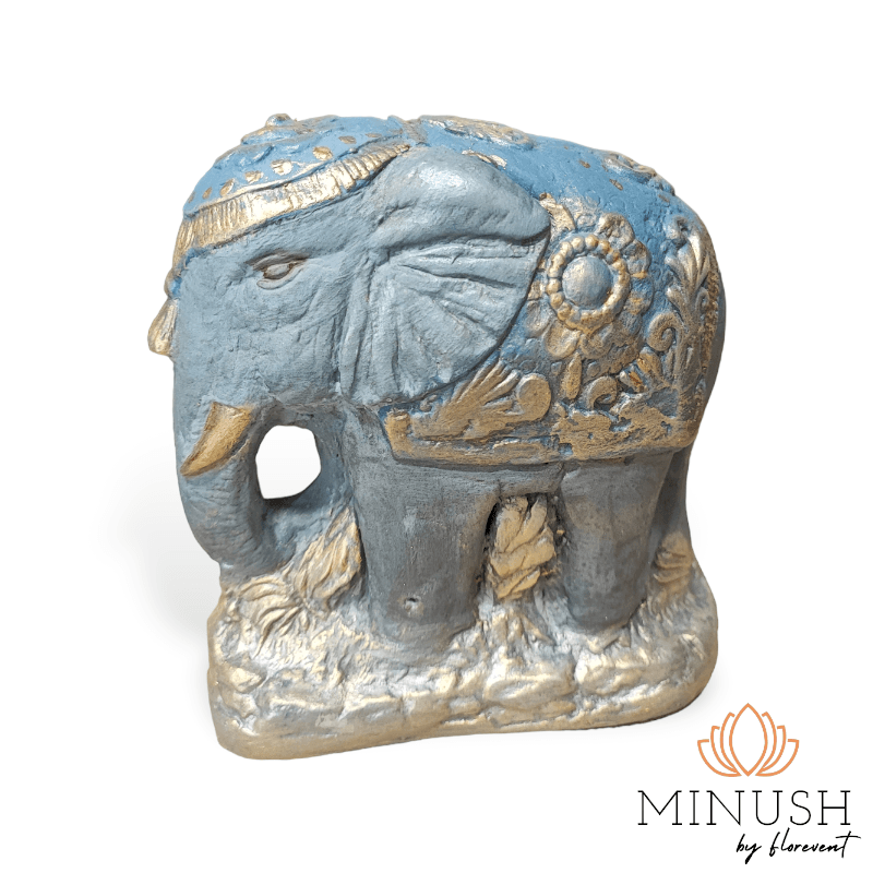 Figura de yeso de elefante hindú pintada a mano con acabado de esmalte acrílico mate, base con felpa para un mejor cuidado de las superficies.