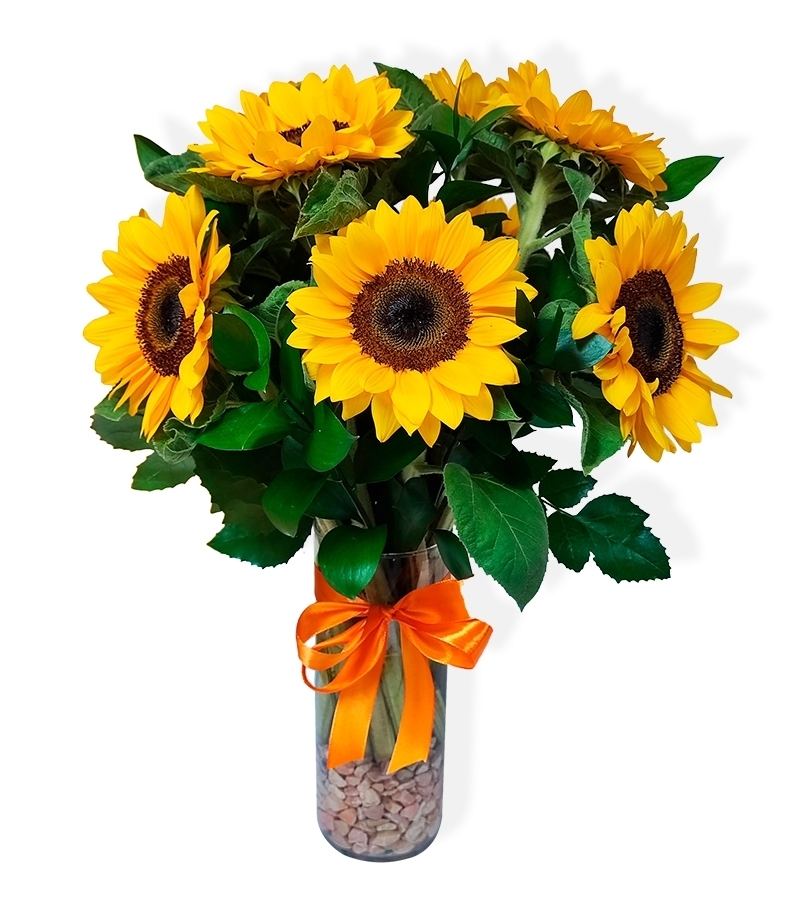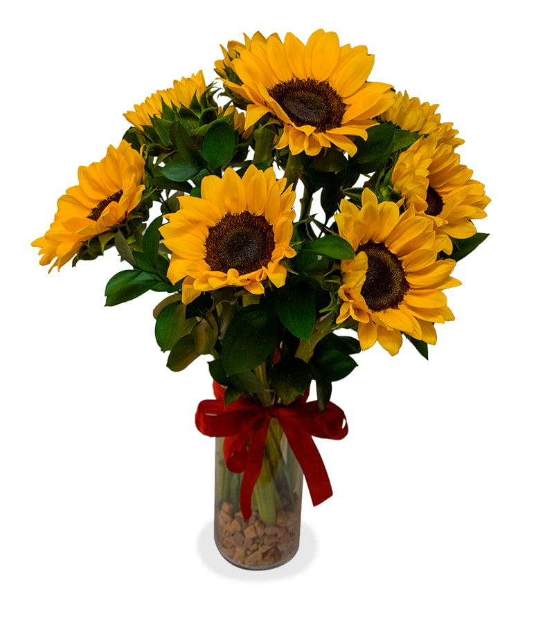 Florero de vidrio compuesto de girasoles (10) acompañados con un toque de follaje y ruscus (10), decorado con lazo de cinta de raso.