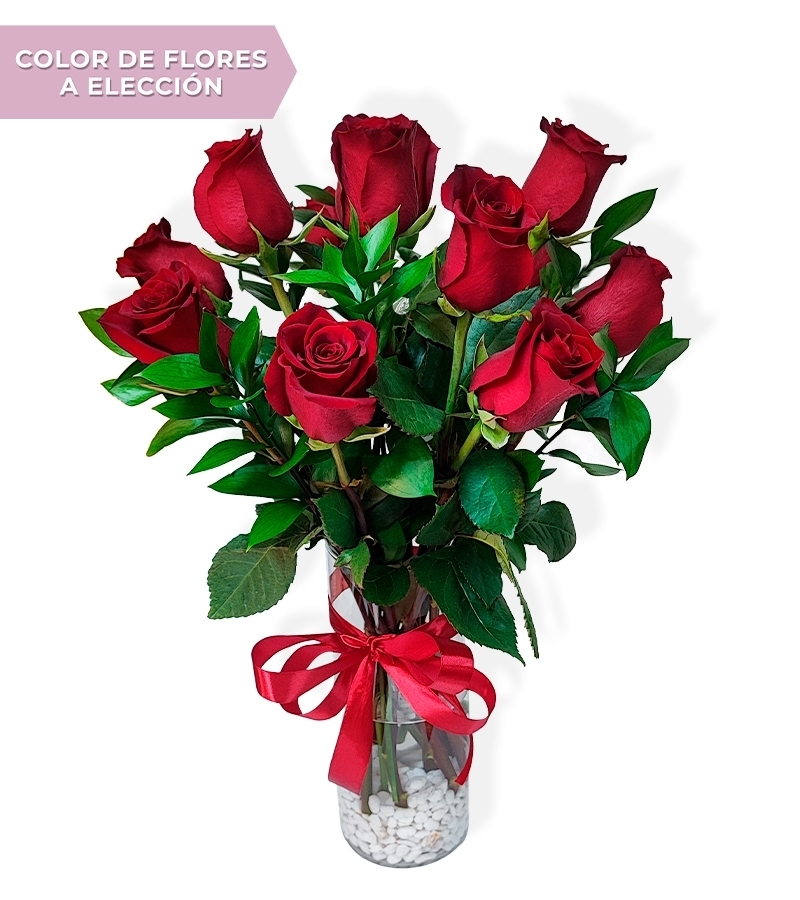 Florero de vidrio compuesto de rosas (12) acompañados con follaje ruscus (10), decorado con lazo de cinta de raso.