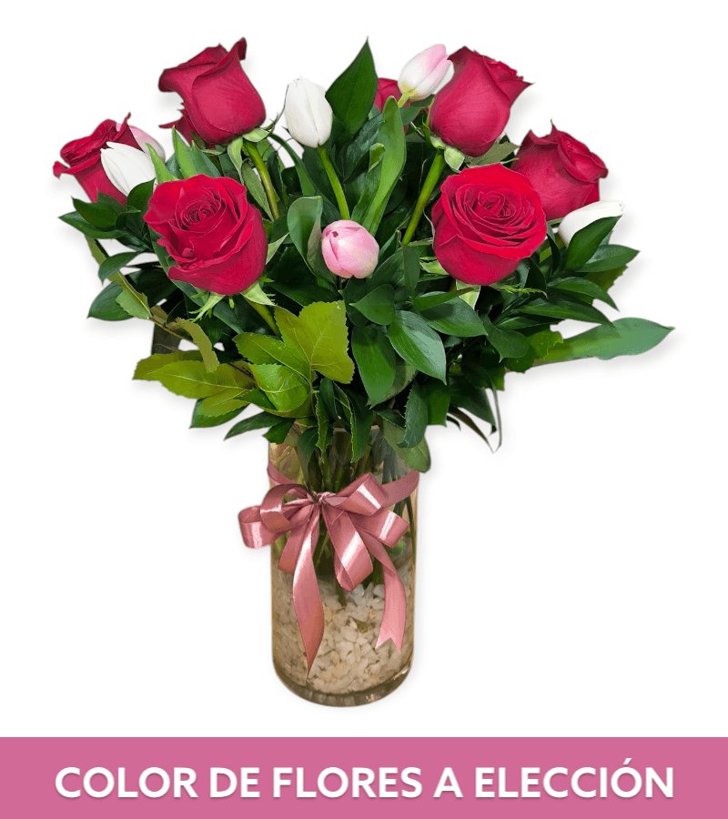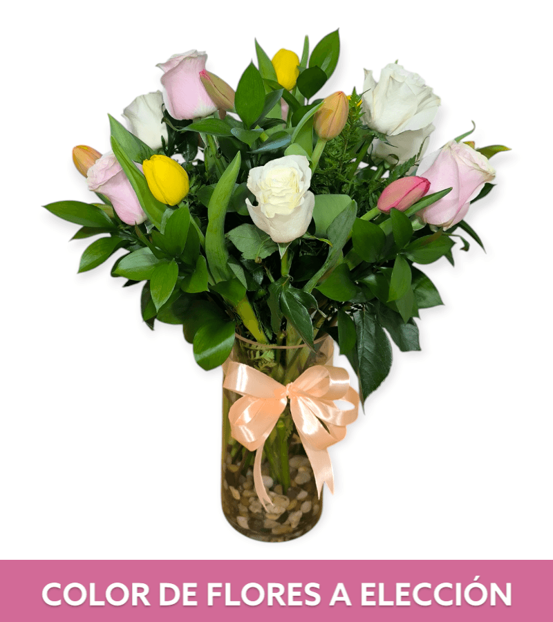 Florero de rosas y tulipanes